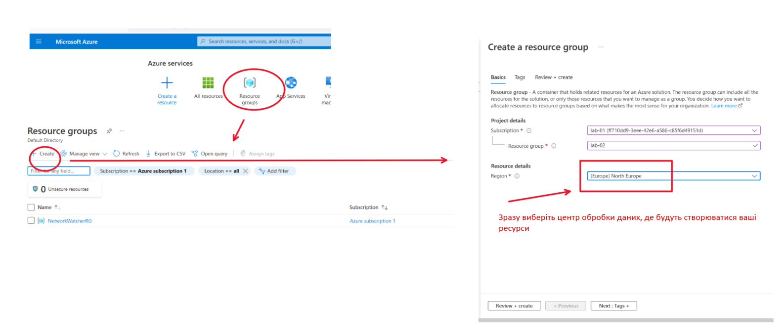 Наступним кроком буде створення ResourceGroupe, що дозволить згурпувати ваші ресурси. В подальшому resource group буде згадуватися при ствренні кожного сервісу і тому потрібно уважно її вибирати. При створенні ResourceGroup потрібо вибрати центр обороки даних, з яким будуть поєдунватись ресурси, створені в рамках цієї групи.