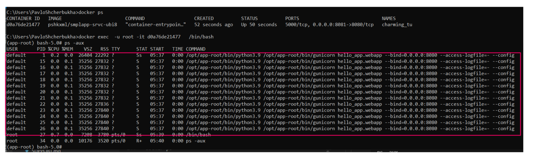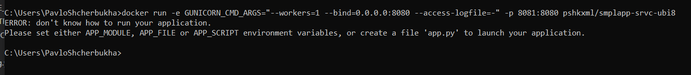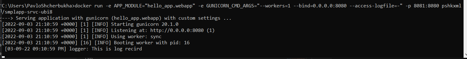 docker run -e GUNICORN_CMD_ARGS="--workers=1 --bind=0.0.0.0:8080 --access-logfile=-" -p 8081:8080 pshkxml/smplapp-srvc-ubi8