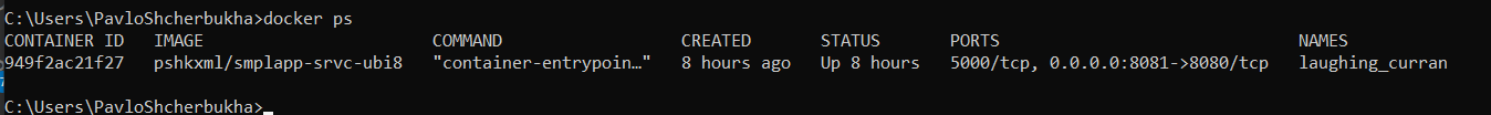 Для цього перевіримо в іншому сеансі CMD, які контейнри запущені командою