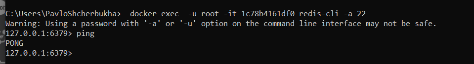 Ну і для перевірки з’єднання задаємо комнаду “PING”, а у відповідь отримуємо PONG. Таким чином в мінімальному вигляді контейнре запущено.