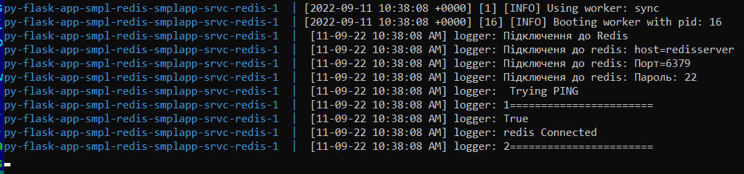 Як видно, парамери підключення параметризуються в ENV-variables сервісу: RDS_HOST, RDS_PORT, RDS_PSW, які вичитуються при старті сервісу і повинні бути задані при старті контейнера (якщо сервіс стартує в контейнері). Підклюення (чи то створення об’єкту підклченя) описано в команді: red = redis.StrictRedis ….. А ось перевырити можливість взаємодії сервіса та redis можна з допопогою команди PING: