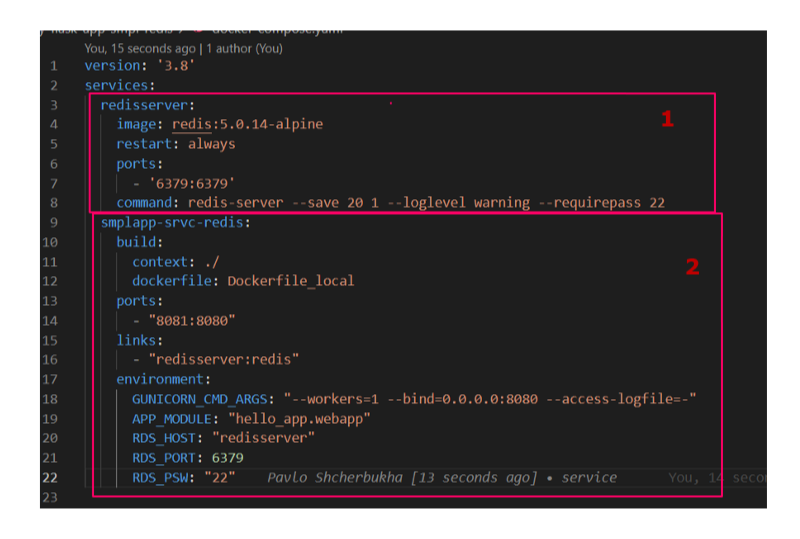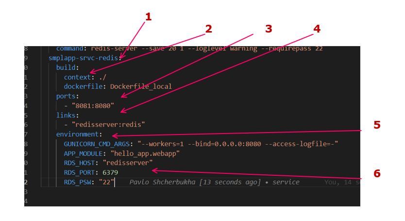 Вказує на блок environments змінних які потрібно задати для старту сервісу. Цифрою 6 показано, як сконфігуровано підключення до redis.