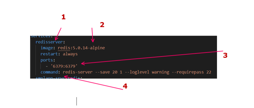 Вказує на блок links, що так би мовити зв’язує два контейнера між собою так, що вони можуть між собою взаємодіяти по tcp/ip. В даному випадку вказано, що сервіс smplapp-srvc-redis може звертатися до сервісу з назвою хоста “redisserver”. :redis це альтернативна назва.