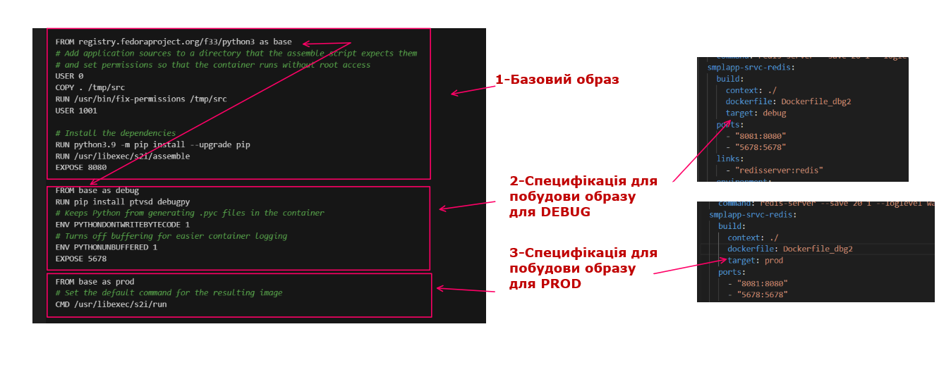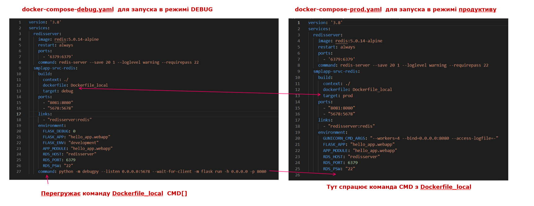 На pic-03 показана порівняльна характеристика docker-comppose - файлів для різних режимів запуску, що будуються з єдного dockerfile.