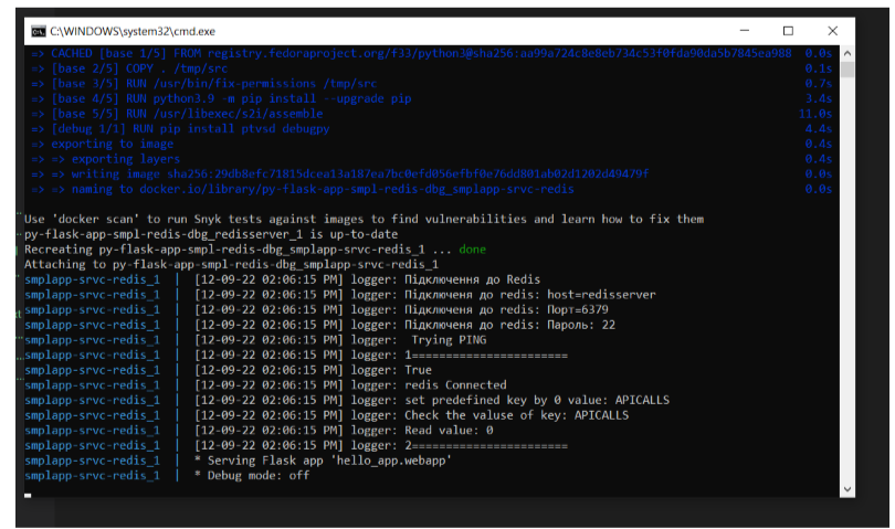 Репозиторій з прикладом доступний за лінком: py-flask-app-smpl-redis-dbg Flask application. Debug додатку, що запущено в контейнері.