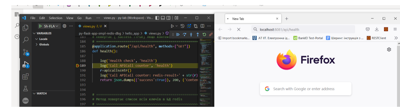 Ну а якщо відкрити файл view.py поставити brakepoint на обробнику метода /api/health то отримаємо зупинку програми при зверенні до http://localhost:8081/api/health як на pic-07.