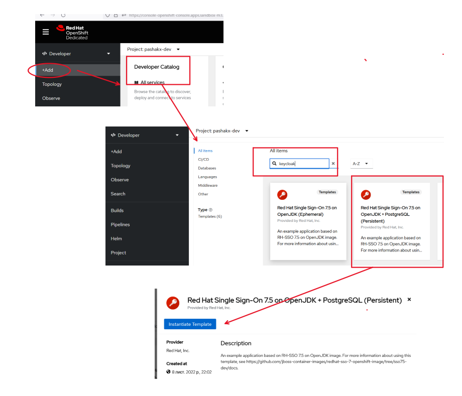 Щоб не мучитися з лінкуванням бази даних та самого сервісу keycloak я використав калог уже підготованих продуктів, що є вже в любому OpenShift і в пару кліків розгорнув додаток pic-01.