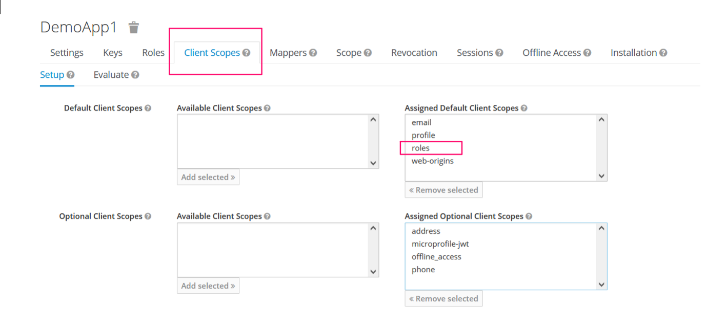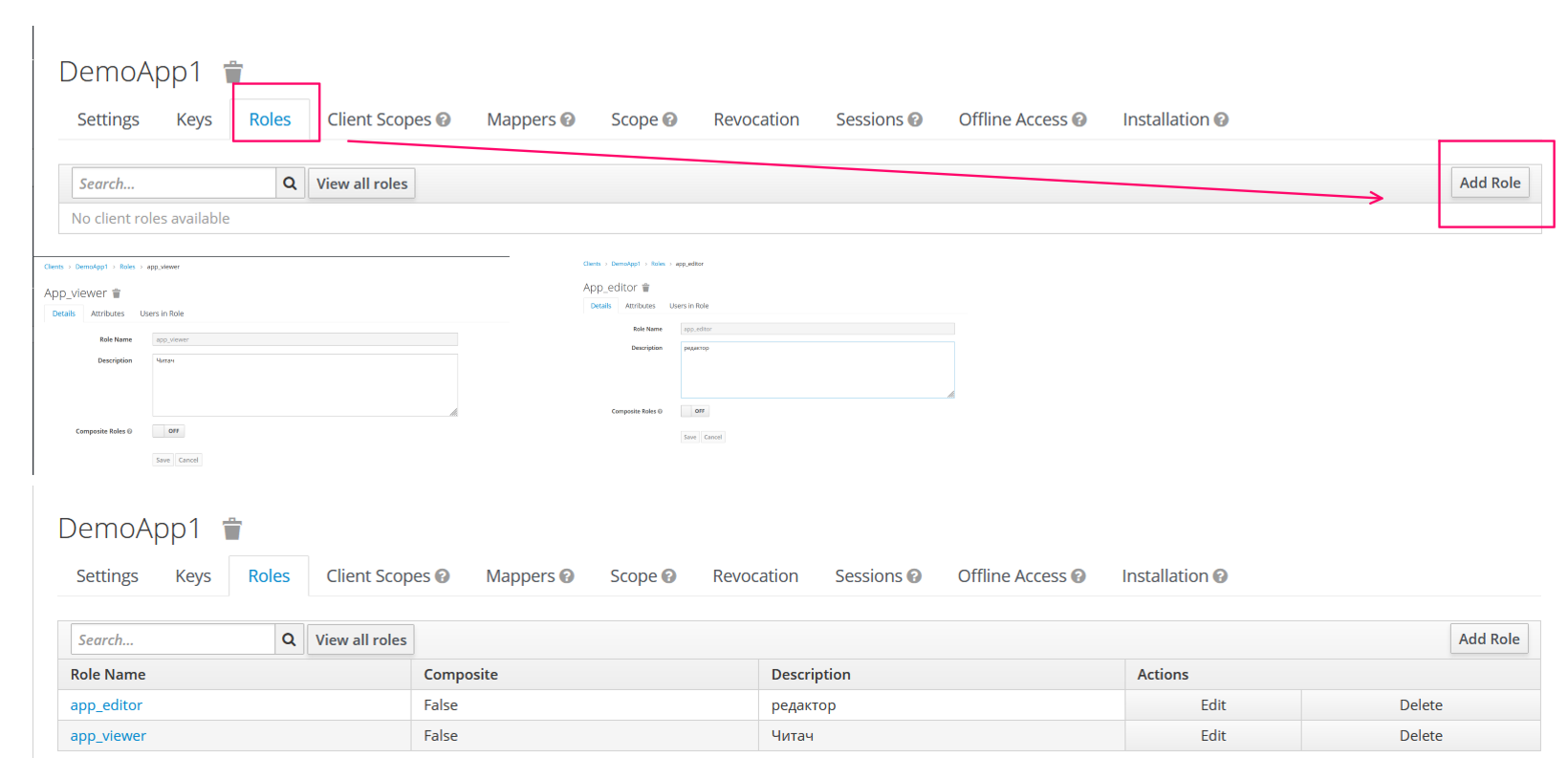 Після реєстрації додатку-клієнта потрібно запараметризувати рольовий доступ до ресурсів програми. Рольовий досутп може ділитися на по ролям. А ролі діляться на Realm Roles та Client Roles.