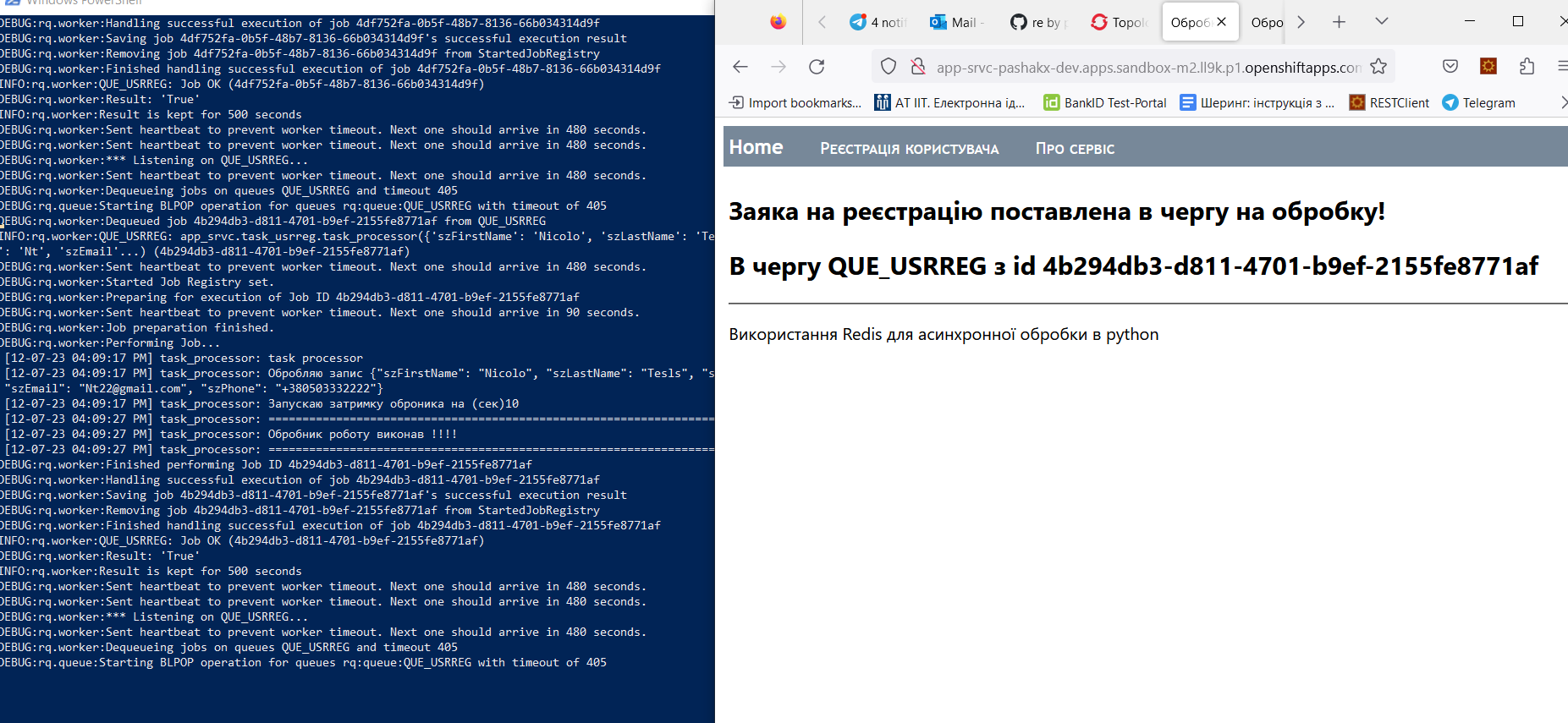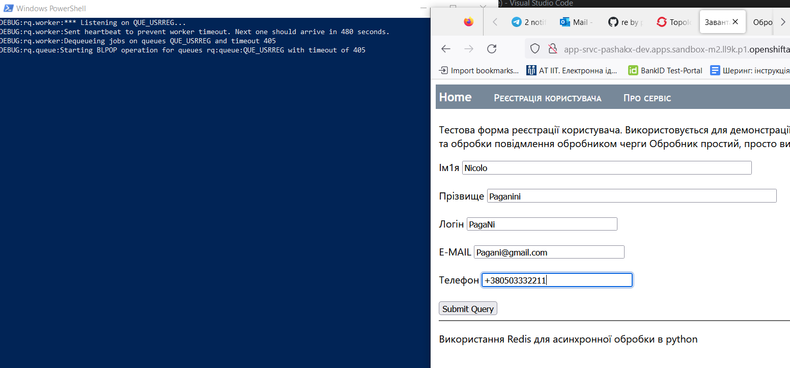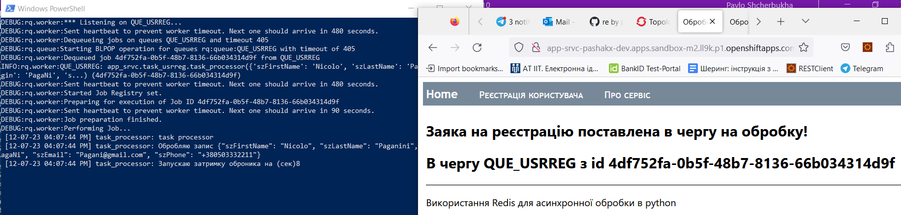 Тобто в вікні (синьому) PowerShell видно лог worker, де видно, що тілько що введені дані були вичитані з черги.