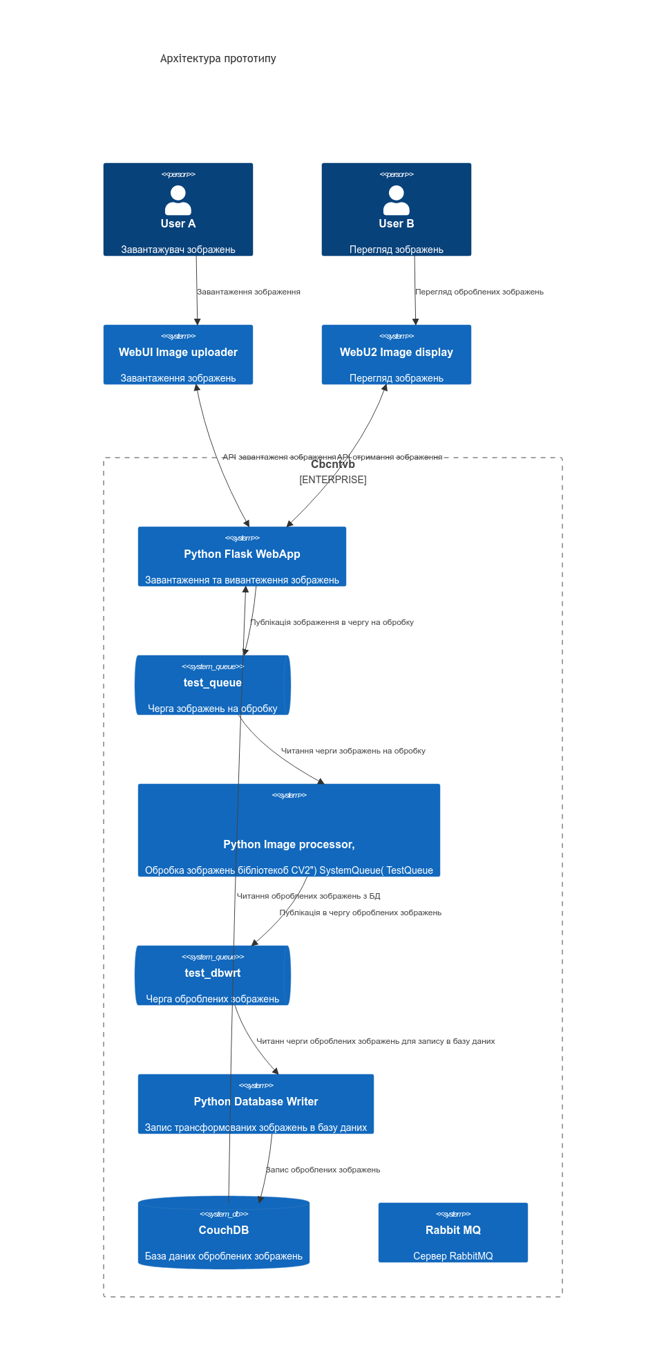 Через Web додаток користувач завантажує зображення в систему. Flask Webervice приймає масив байт зображення та публікує зображення в чергу test_queue з специфічними заголовками. В заголовках вказується тип медіаконтенту та назва файлу.