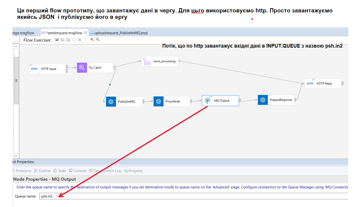 Перш ніж малювати архітектуру, спробую розказати, як це прауює в IBM MQ. Найпростіший та рекомендований варіант Retry Pattern, це варіант мінімально вимагає додаткової логіки в ACE, покладаючись на вбудовані можливості IBM MQ. Для цього був зроблений прототипчик. На pic-201 показано flow, що завантажу JSON повідомлення в чергу psh.in2. Це так би мовити основна черга.