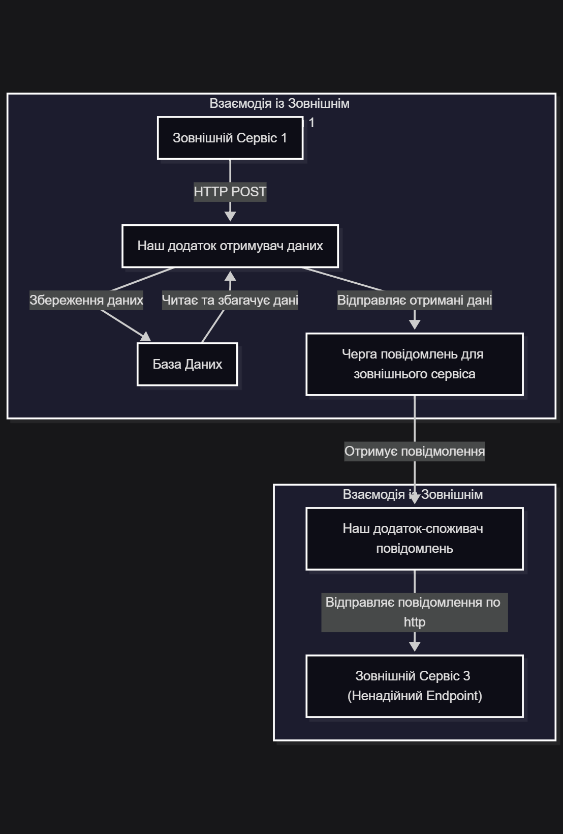 По суті це два не залежні компоненти. Вони зв’язані між собою “м’яким зв’язком”. Тобто, зупинка компонента “Наш додаток-споживач повідомлень” - ніяким чином не вплине на “Наш додаток отримувач даних”. Просто в черзі будуть накопичуватися повідомлення для “Зовнішній Сервіс 3”. А от коли “Наш додаток-споживач повідомлень”запустять, то “Зовнішній Сервіс 3” отримає всі повідмолення, що накопичилися за час простою. Вже трошки краще, але всерівно не зрозуміло, коли даємо відповідь “Зовнішній Сервіс 1” по http. Так як “Зовнішній Сервіс 3” є за визначенням не надійним, то при короткострокових проблемах інфраструктури, чи “Зовнішній Сервіс 3” раптом “втомиться” - то всі ці повідомлення вилетять тільки в лог з помилками. Знову ж таки хорошого в цьому мало, тому, що копирасатися в логах і пояснювати власникам “Зовнішній Сервіс 3”, чому по таймаут (проблеми мережі) нічого не дішло - теж справа безнадійна, особливо коли немає впливу на інфраструктуру. І по діаграмі не зрозуміло, а що робити коли Зовнішній Сервіс 3” почне відповідати помилками.