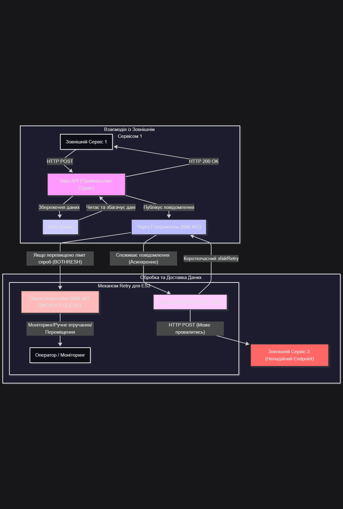 Черга Повідомлень (Напр. IBM MQ): Це ключовий елемент архітектури. Замість прямого виклику ненадійного сервісу 3, Воркер Retry асинхронно відправляє підготовлене повідомлення до черги.