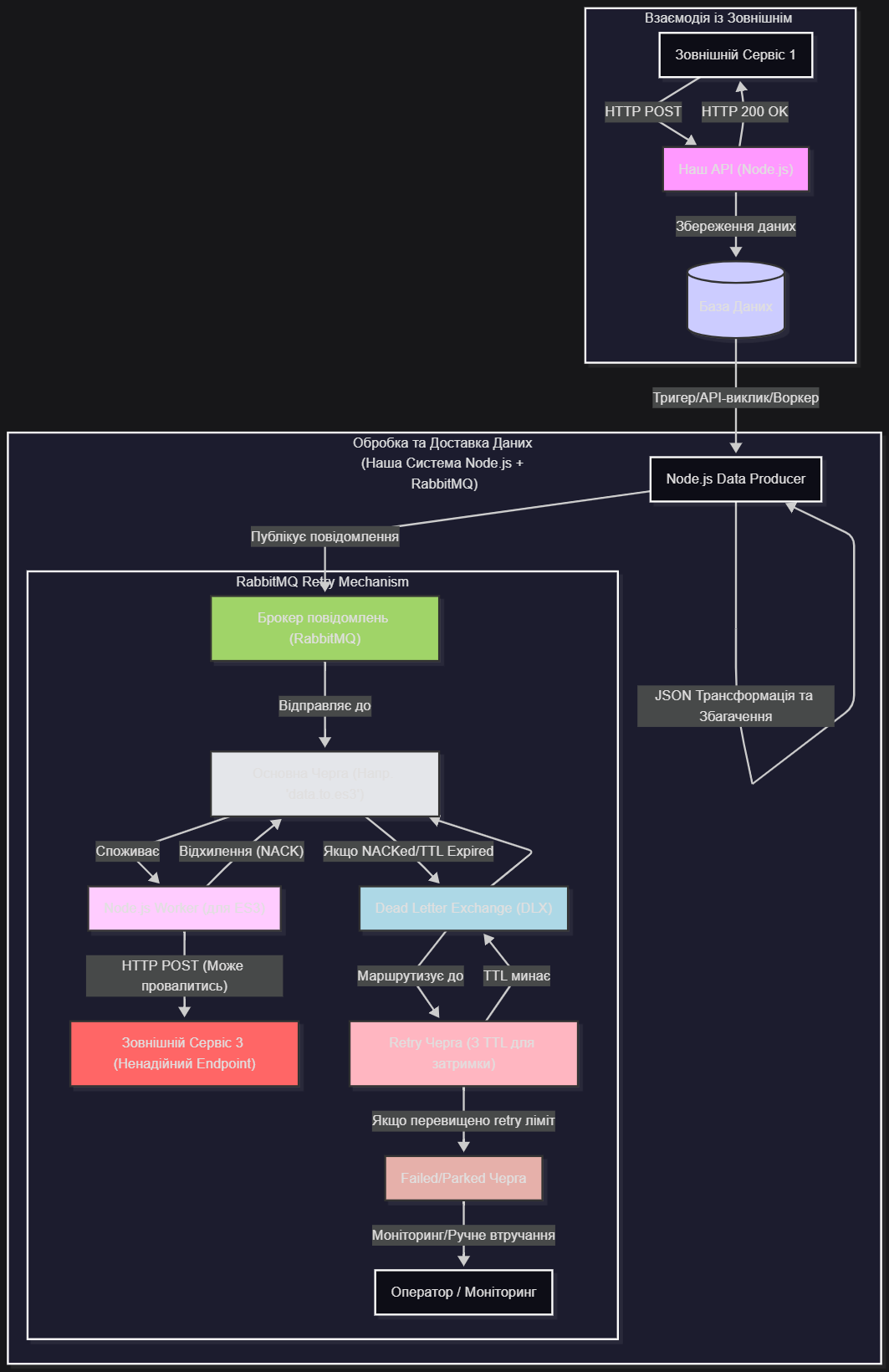 Node.js Worker (для ES3): Це Node.js додаток (споживач), який читає повідомлення з 'Основної Черги'. Він виконує HTTP POST запит до Зовнішнього Сервісу 3.